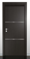 Az ajtó felületét három egyenlő részre osztottuk. Elválasztó elemként elegáns fémintarziát használtunk, mely még letisztultabbá, kifinomultabbá teszi ezt a modellt.
